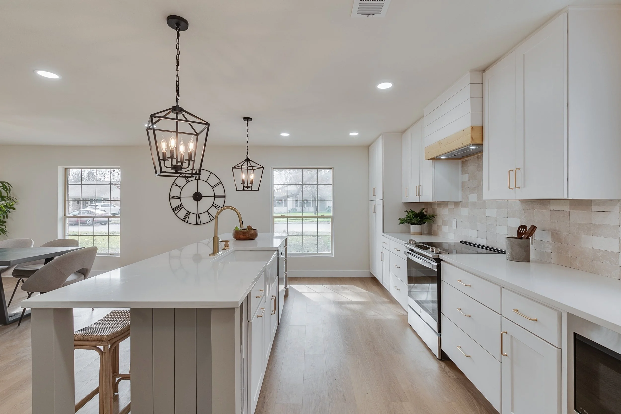 Dallas suburb brick facade homes are common but this one stands alone. This once boxy and compartmentalized living space was completely gutted and redesigned to accommodate transparent, relationship driven living. Indoor laundry, two full bathrooms and a darling modern farmhouse kitchen all dressed in tumbled marble and a neutral palette make this redevelopment project a classic fit for a growing family.